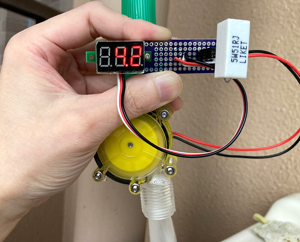 改めて見直すと、電圧計の値を注視しすぎて、出力のケーブルにまで水がはねて基板が濡れそうでした。。